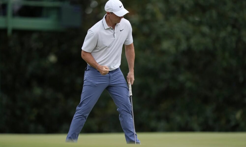 Rory McIlroy, of Northern Ireland, celebrates after making a putt on the fifth hole during the third round at the Masters golf tournament, Saturday, April 12,...