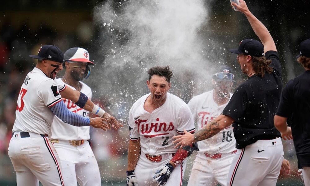Minnesota Twins’ Brooks Lee (2) celebrates with teammates after reaching on a winning infield RBI bunt to score teammate Byron Buxton during the ninth inning of...