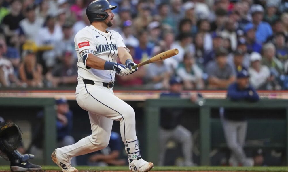 Seattle Mariners’ Cal Raleigh follows through on a three-run home run against the Tampa Bay Rays during the third inning of a baseball game Saturday, Aug....