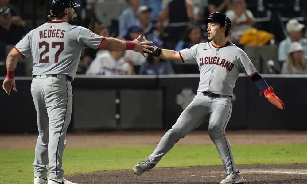 Cleveland Guardians’ Austin Hedges (27) and Steven Kwan celebrate after scoring on a two-run double by José Ramírez off Tampa Bay Rays pitcher Ian Seymour during...