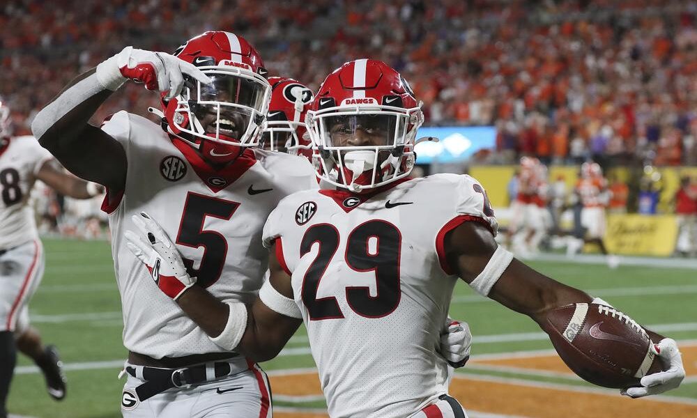 Georgia defensive back Christopher Smith celebrates with Kelee Ringo, left, after intercepting a Clemson pass and returning it for a touchdown during the second quarter of...