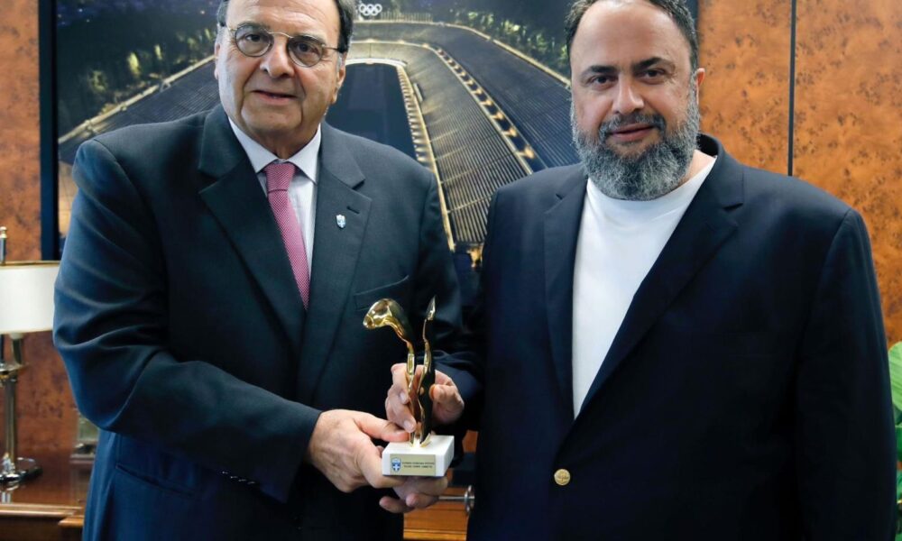 President of the Hellenic Olympic Committee, Isidoros Kouvelos, with Vangelis Marinakis, owner of Capital Maritime & Trading Corp. Photo: Hellenic Olympic Committee Evangelos Marinakis, Capital Maritime...