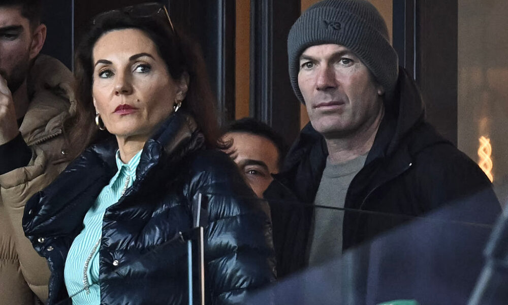 Former French footballer and father of Algeria’s goalkeeper #23 Luca Zidane, Zinedine Zidane (R) and his wife Veronique Zidane (L) watch during the Africa Cup of...