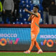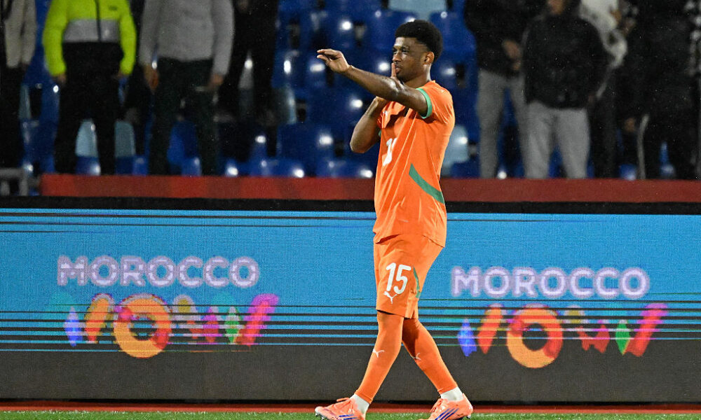 Ivory Coast’s forward #15 Amad Diallo celebrates scoring the team’s first goal during the Africa Cup of Nations (CAN) Group F football match between Ivory Coast...
