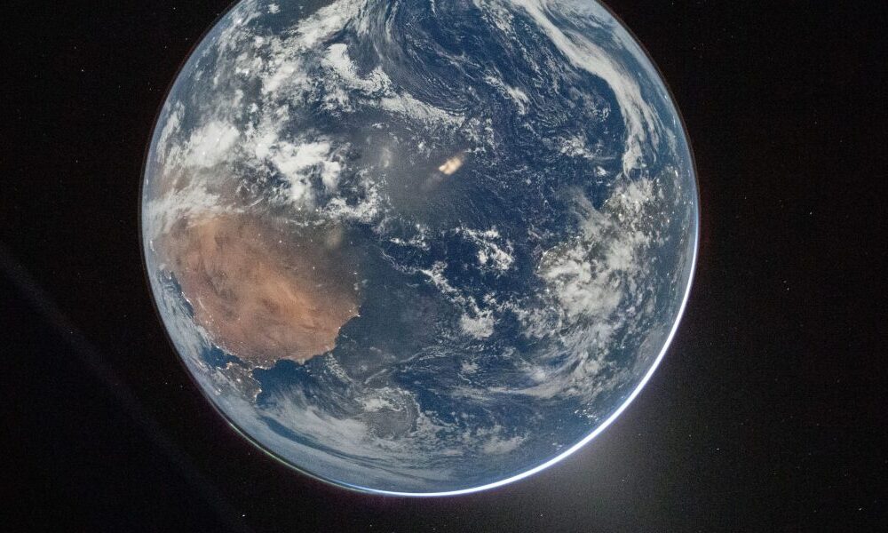 The first photo taken by commander Reid Wiseman shows a curved slice of Earth in one of the capsule’s windows. The second shows the entire globe with the oceans topped by swirling white tendrils of clouds. A green aurora even glows, according to NASA.