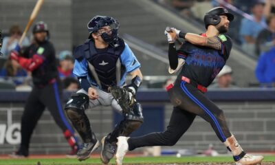 Toronto Blue Jays’ Nathan Lukes (38) hits a two-run home run off Tampa Bay Rays pitcher Adrian Houser as Rays catcher Hunter Feduccia (30) looks on...