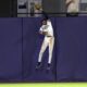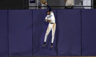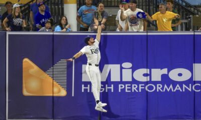 Tampa Bay Rays outfielder Chandler Simpson makes a leaping catch on a fly ball from Toronto Blue Jays’ Alejandro Kirk during the fourth inning of a...