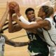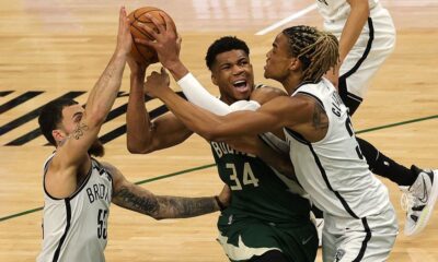 WNBA – MILWAUKEE, WISCONSIN – JUNE 10: Giannis Antetokounmpo #34 of the Milwaukee Bucks is defended by Nicolas Claxton #33 and Mike James #55 of the...