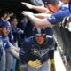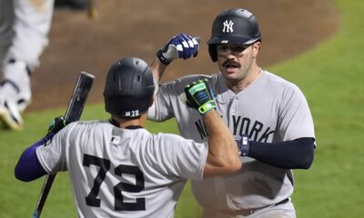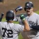 Dodgers-New York Yankees’ Austin Wells (28) celebrates with José Caballero (72) after Wells hit a home run off Tampa Bay Rays pitcher...