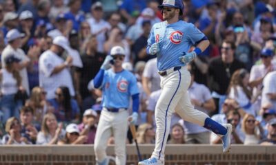 Chicago Cubs’ Ian Happ (8) runs the bases after hitting a home run during the fourth inning of a baseball game against the Tampa Bay Rays,...