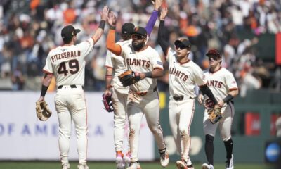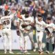 San Francisco Giants ‘ Tyler Fitzgerald, left, celebrates with Willy Adames, middle rear, Heliot Ramos, middle, Jung Hoo Lee, second from right, and Drew Gilbert after...