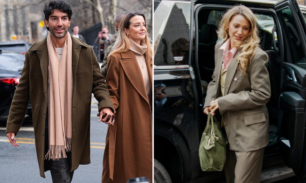 Blake donned a khaki double-breasted suit, tan vest, and pink button-up shirt with a green suede purse, while Baldoni similarly wore an olive teddy coat and pink scarf.