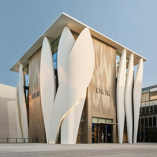 The innovative sculptural building is fronted by petal-shaped shells, suggesting the movement of the toiles with which Monsieur Dior dreamed up the New Look. The vertical fronts are punctuated with handcrafted golden glass tiles: a colour traditionally reserved for royalty in China.