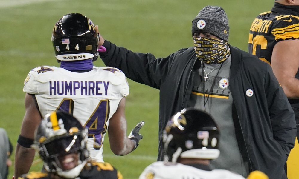 Pittsburgh Steelers coach Mike Tomlin, right, greets Baltimore Ravens cornerback Marlon Humphrey (44) after an NFL football game Wednesday, Dec 2, 2020, in Pittsburgh. The Steelers...