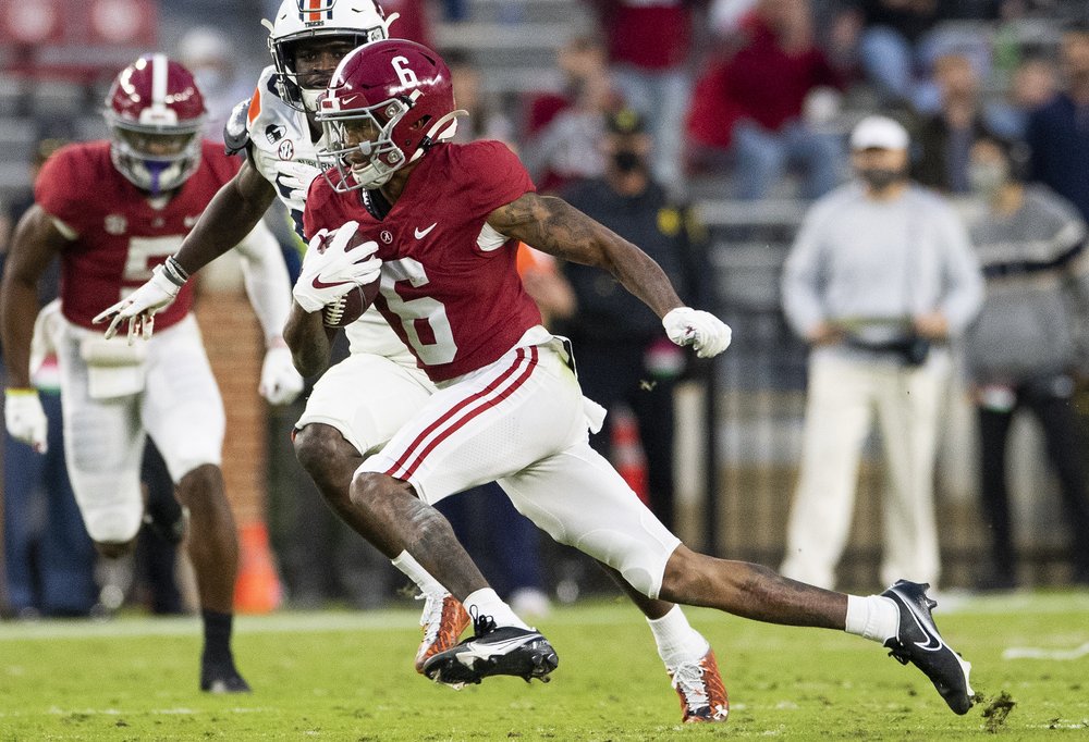 Alabama wide receiver DeVonta Smith (6) breaks free for a touchdown against Auburn during an NCAA college football game Saturday, Nov. 28, 2020, in Tuscaloosa, Ala. (Mickey Welsh/The Montgomery Advertiser via AP)