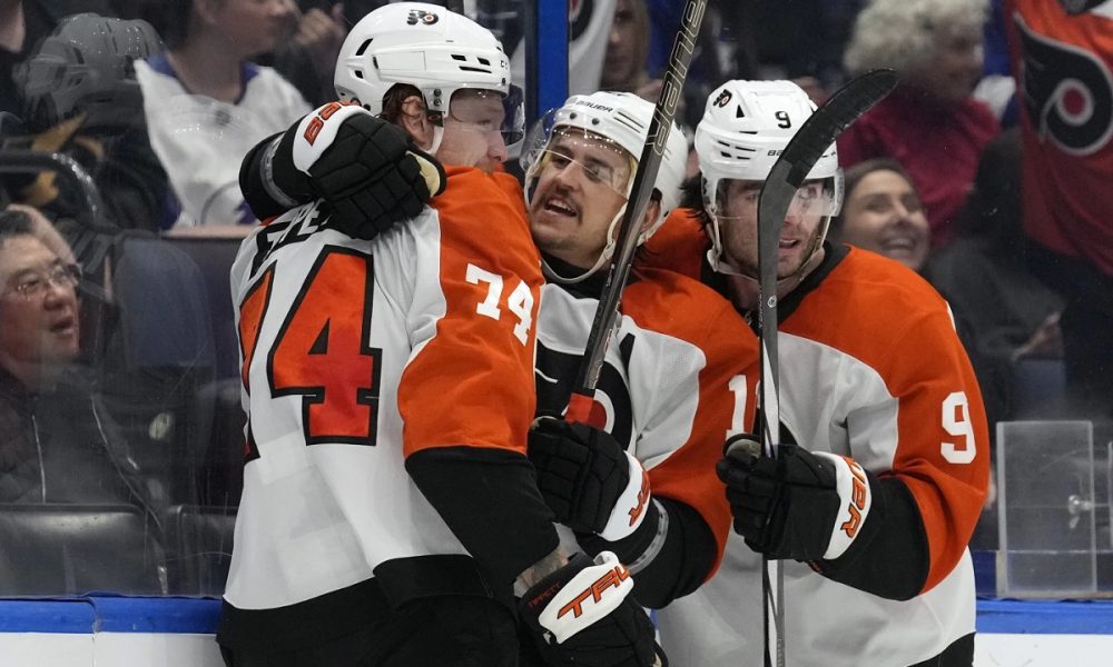 Philadelphia Flyers right wing Owen Tippett (74) celebrates his goal against the Tampa Bay Lightning with right wing Travis Konecny (11) and defenseman Jamie Drysdale (9) during the third period of an NHL hockey game Thursday, Nov. 7, 2024, in Tampa, Fla. (AP Photo/Chris O’Meara)