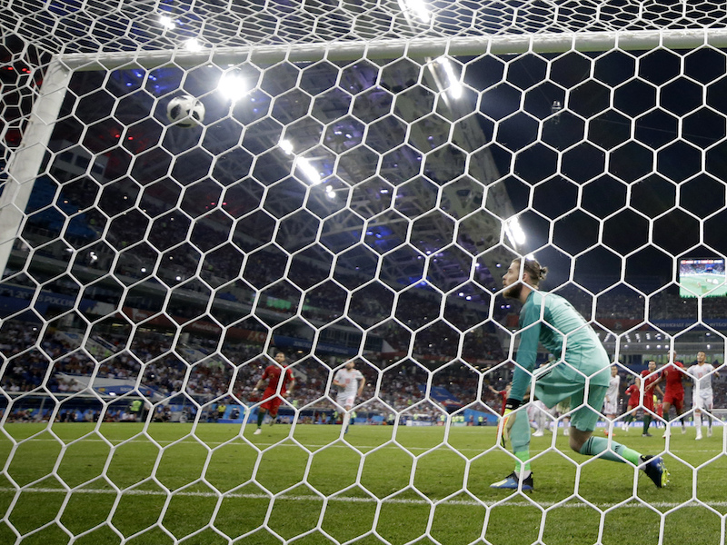 Spain goalkeeper David De Gea looks to the ball when Portugal’s Cristiano Ronaldo scores his side’s third goal during the group B match between Portugal and Spain at the 2018 soccer World Cup in the Fisht Stadium in Sochi, Russia, Friday, June 15, 2018. (AP Photo/Sergei Grits)