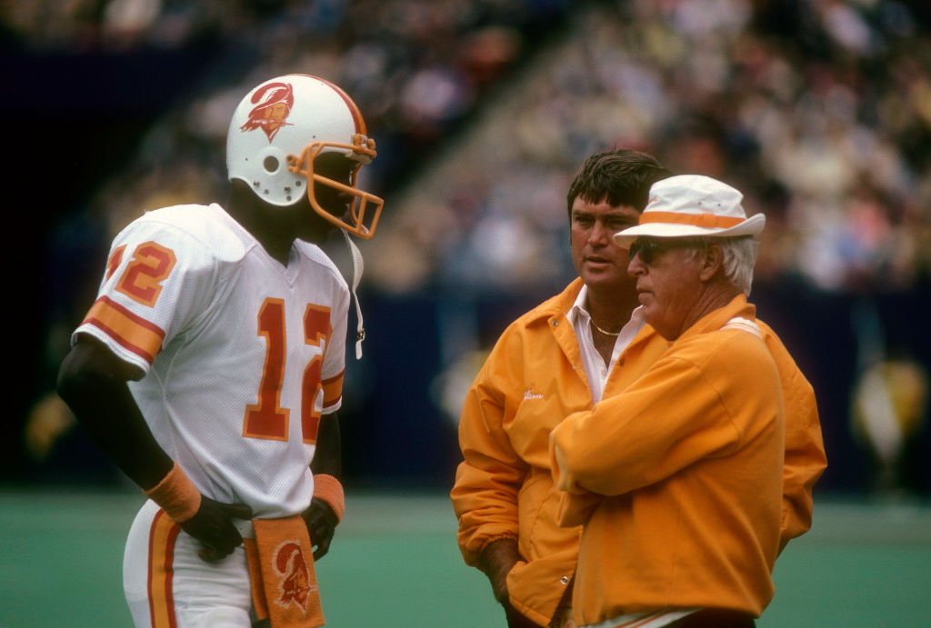 Quarterback Doug Williams #12 of the Tampa Bay Buccaneers talking with Head Coach John McKay (R) circa 1978 during an NFL football game. Williams played for the Buccaneers from 1978-82.AP PHOTOS