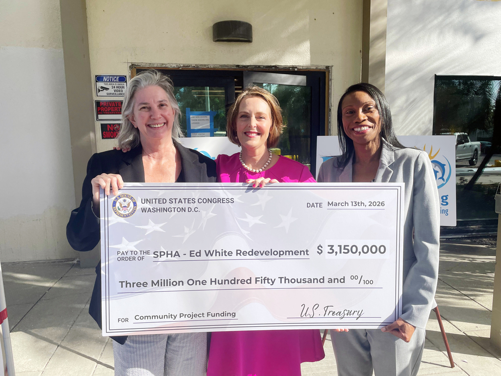 U.S. Rep. Kathy Castor presented a $3.15 million federal funding check to the St. Petersburg Housing Authority (SPHA) to help finance the redevelopment of the former Edward White Hospital into a new affordable housing and community services campus.