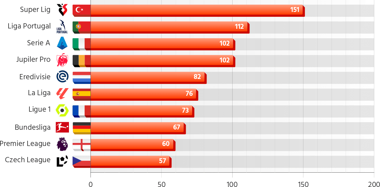 Managerial changes vary from 151 in Turkiye’s Super Lig to just 57 in the Czech league