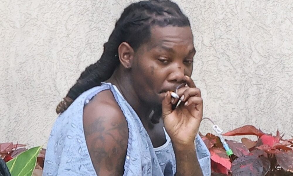 Check out these photos of Offset being wheeled outside for a smoke break … he’s got non-slip hospital socks, hospital wristbands, a bandage on his arm, and some wires coming off his fingertip.