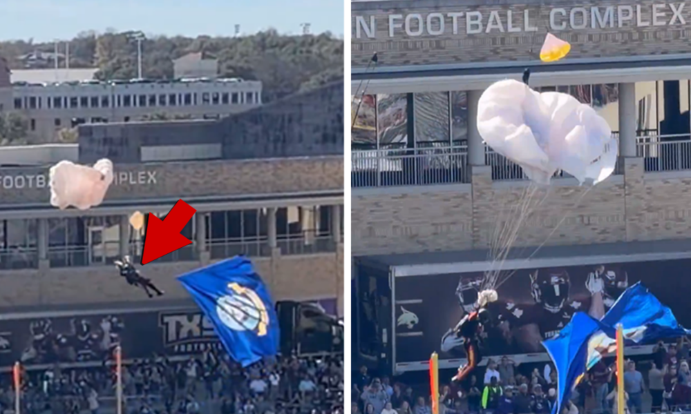 According to WFAA, a local Dallas outlet, the parachutist was able to walk off the field under his own power … though we’re sure he’ll be a little sore in the morning.
