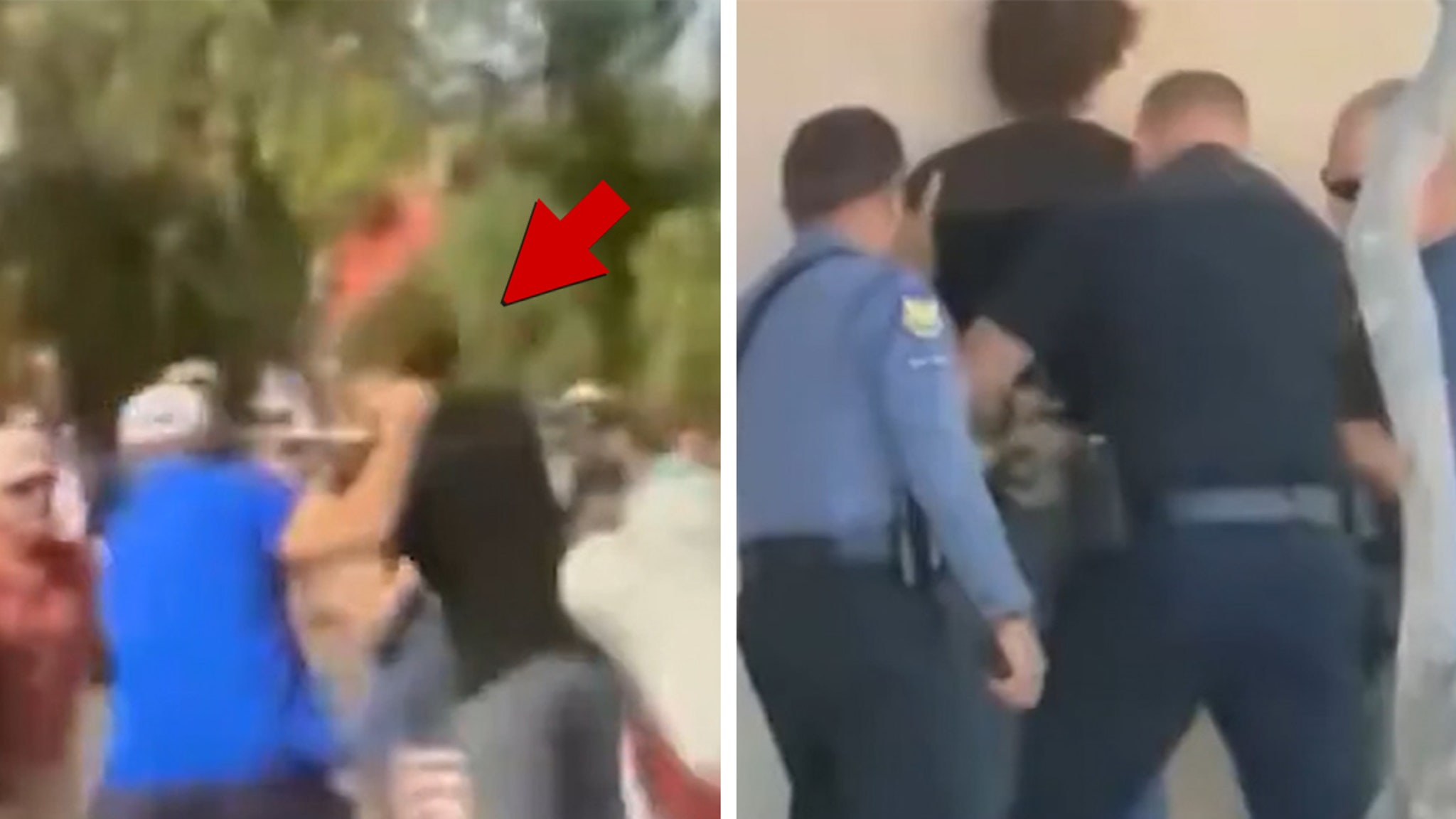 Another guy in a blue shirt comes up and hurls this protester to the ground … and a crowd gathers around him before he tries to walk off — when he’s surrounded by what looks like two security guards and a police officer.