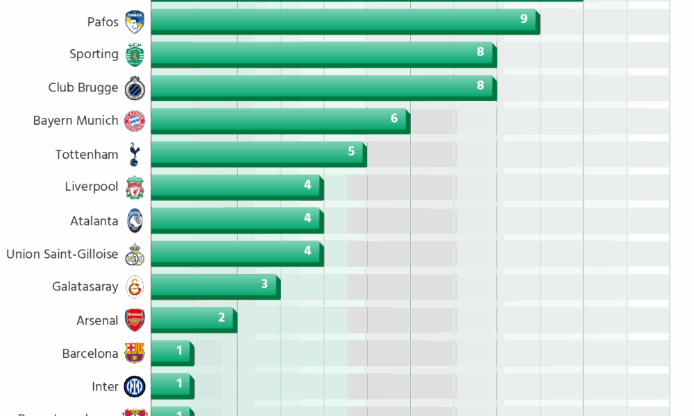 - Qarabag (+12), Olympiacos (+11), Bodo/Glimt (+10) and Pafos (+9) are the competition’s biggest overachievers, all finishing at least nine places higher than their budget level would imply