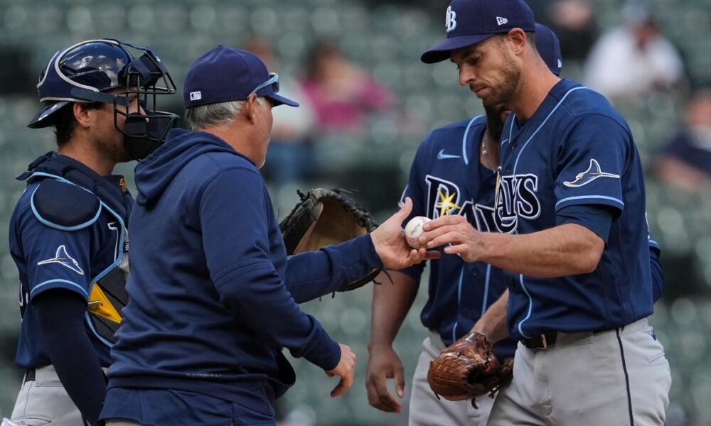 Tampa Bay Rays manager Kevin Cash, second from left, takes the ball from starting pitcher Steven Matz, front right, during the sixth inning of a baseball game against the Chicago White Sox in Chicago, Thursday, April 16, 2026. (AP Photo/Nam Y. Huh)