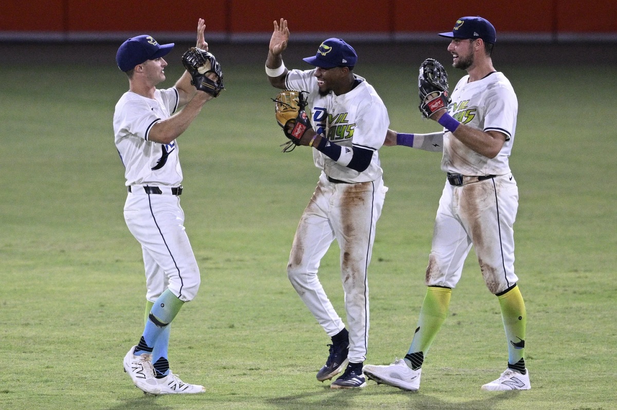 Tampa Bay Rays outfielders Jake Mangum, left, Chandler Simpson and Josh Lowe, right, celebrate their win against the Baltimore Orioles in a baseball game, Saturday, July 19, 2025, in Tampa, Fla. (AP Photo/Phelan M. Ebenhack)
