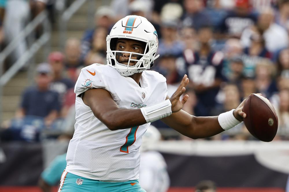 FILE – In this Sunday, Sept. 12, 2021 file photo, Miami Dolphins quarterback Tua Tagovailoa passes against the New England Patriots during the first half of an NFL football game in Foxborough, Mass. Quarterback Tua Tagovailoa has fractured ribs and won’t play Sunday, Sept. 26, 2021 when the Dolphins visit the Raiders. Miami coach Brian Flores did not want to offer a timetable for a potential return but said Tagovailoa is already improving. Jacoby Brissett will start against Las Vegas.(AP Photo/Winslow Townson, File)