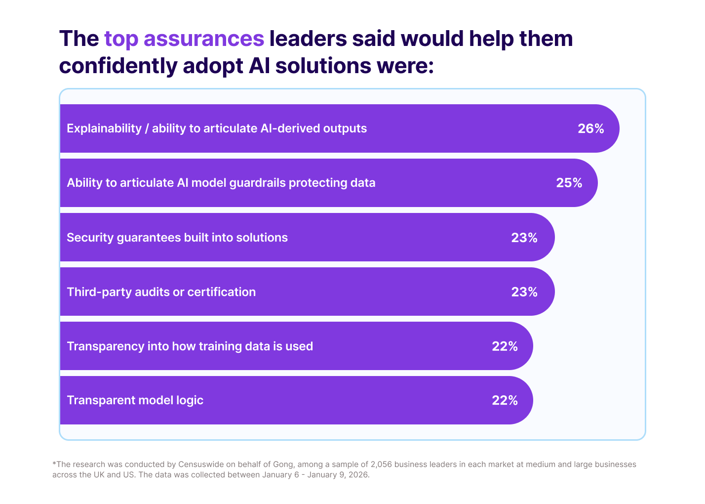 Some of the top assurances that leaders were looking for, according to the study, include explainability and the ability to articulate AI-derived outputs (26%), the ability to explain AI model guardrails protecting data (25%), built-in security guarantees (23%), and third-party audits or certification (23%).